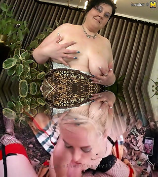 Mommy-in-law boinks her hairy pussy with her fingers and gets cum on her gorgeous ample ass at home